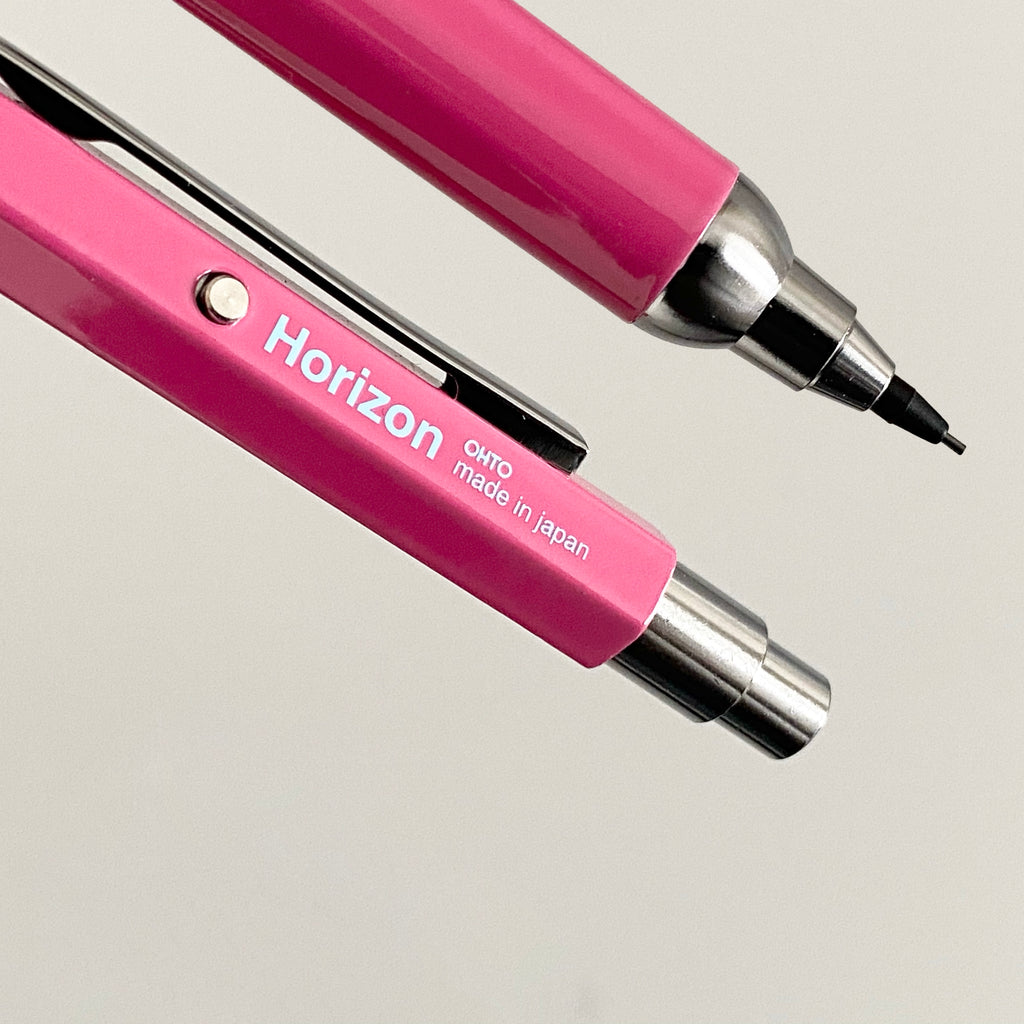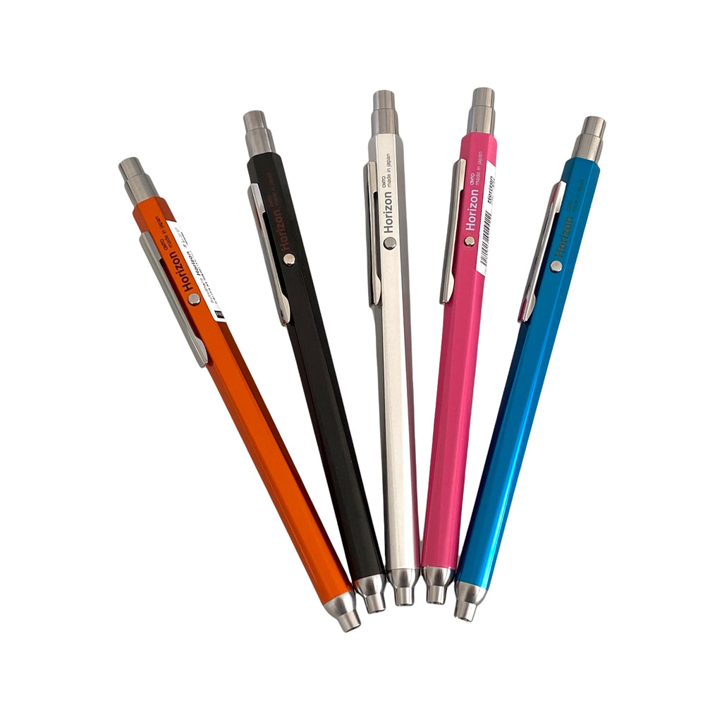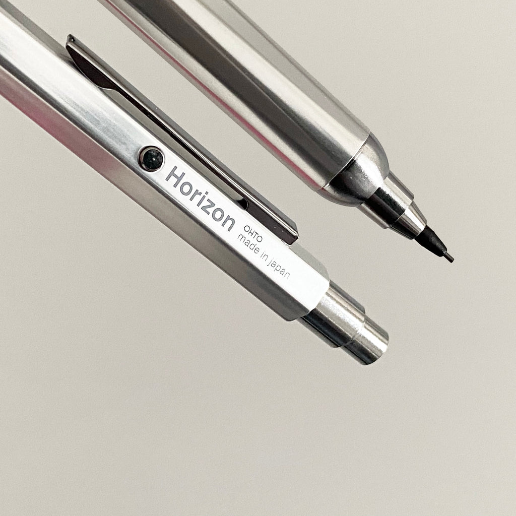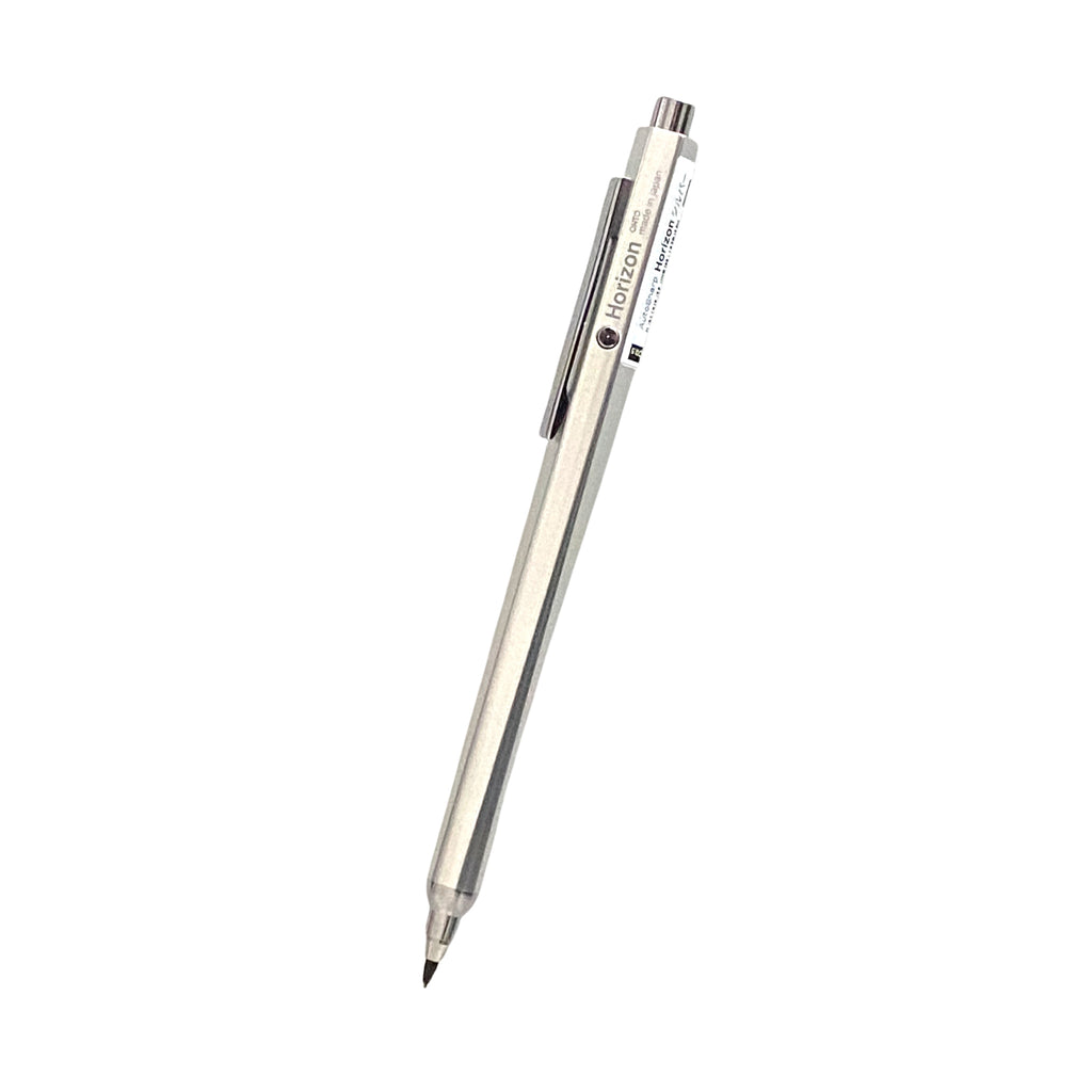 El portaminas Horizon de OHTO va equipado con el mecanismo de "doble golpe". Un empuje firme en el botón superior extiende todo el mecanismo de la mina fuera del barril. Empujes adicionales sacarán la mina normalmente. Para retraer la punta, simplemente presiona el botón del costado del portaminas.