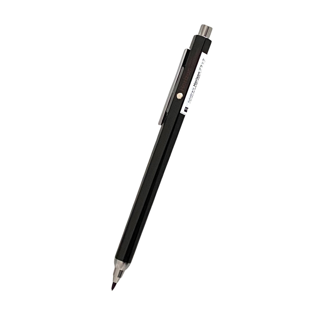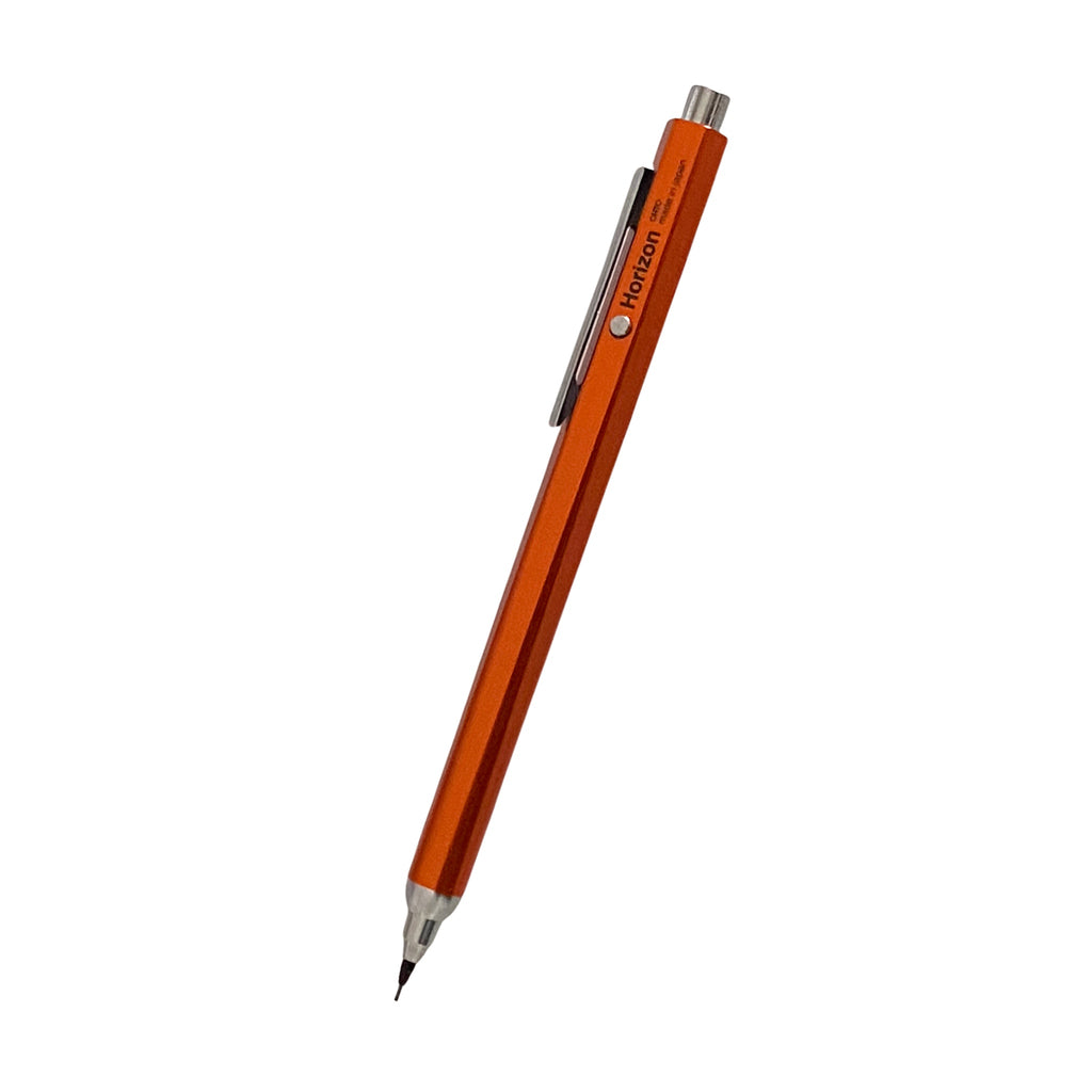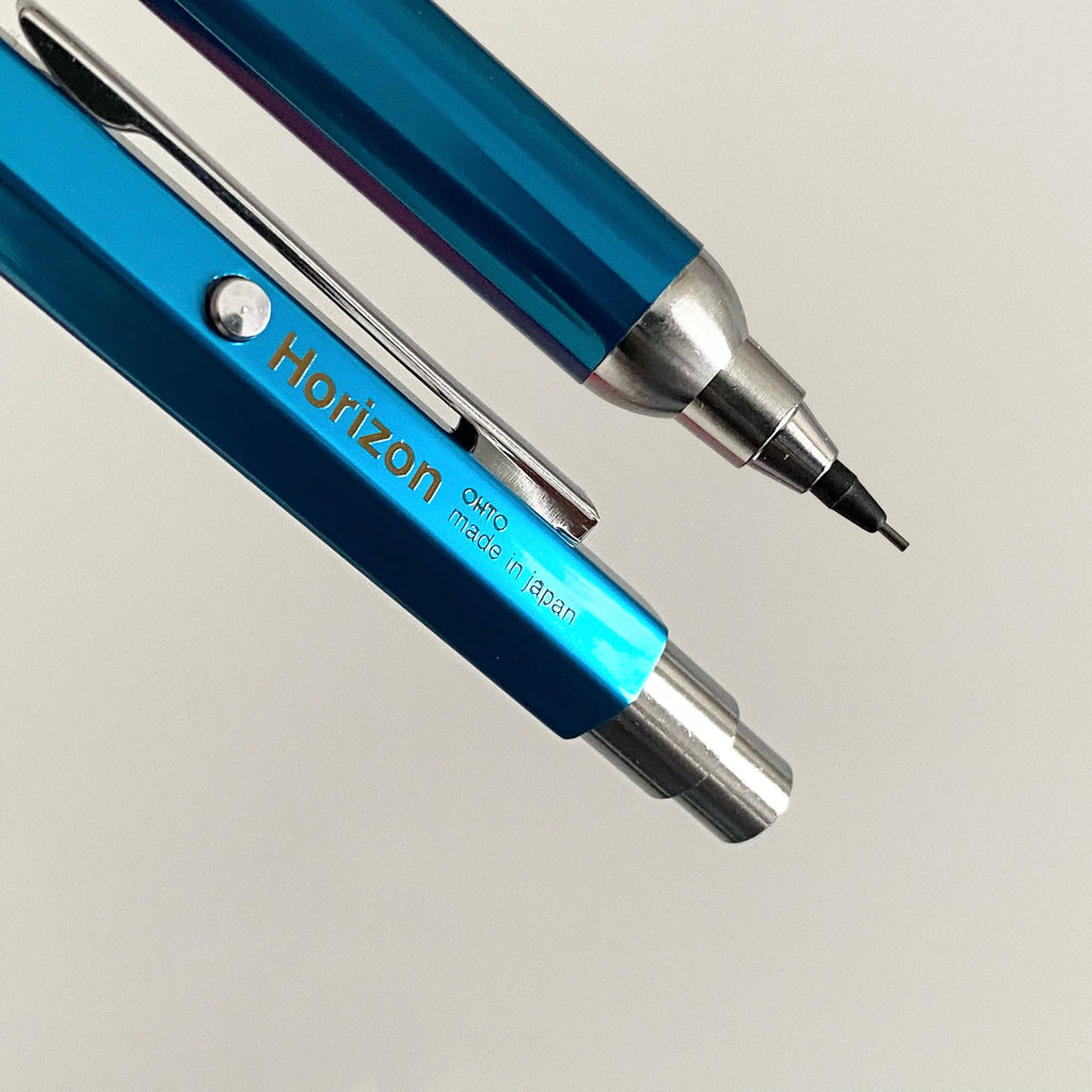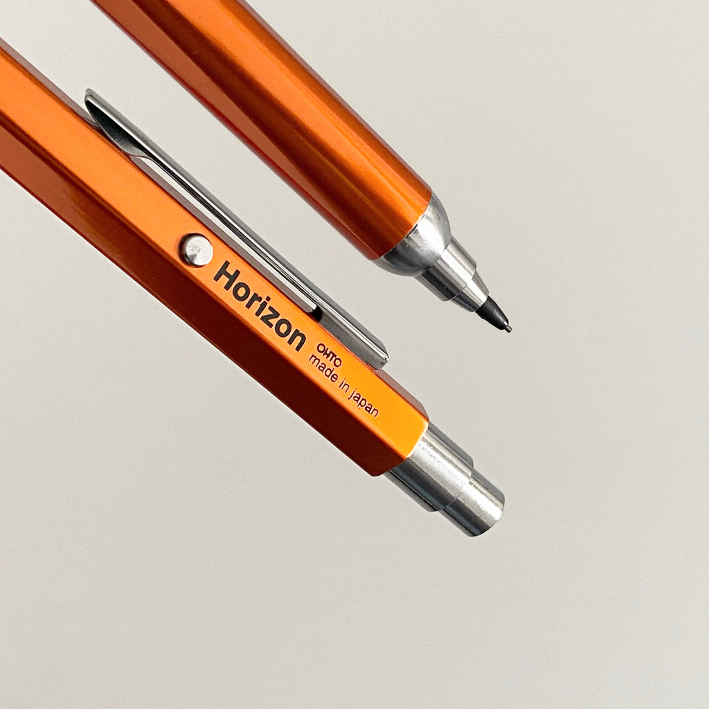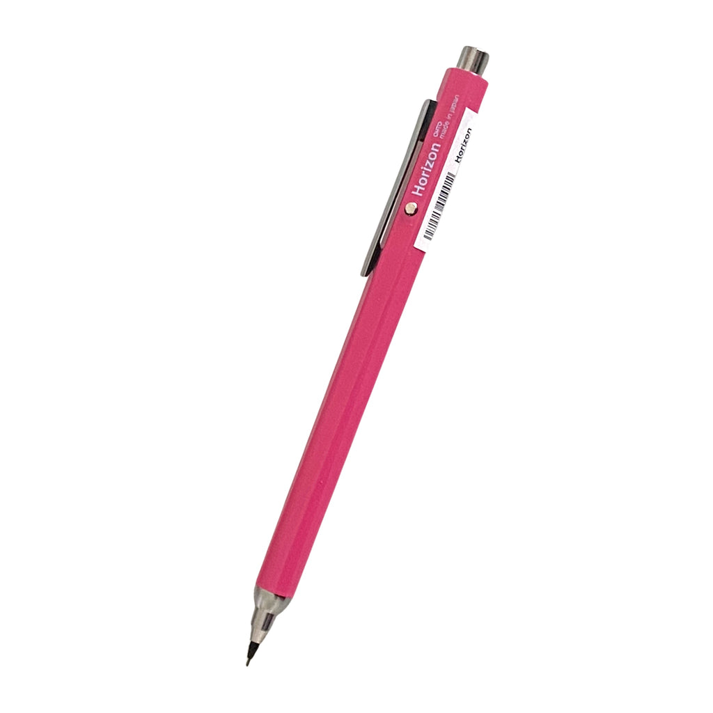 El portaminas Horizon de OHTO va equipado con el mecanismo de "doble golpe". Un empuje firme en el botón superior extiende todo el mecanismo de la mina fuera del barril. Empujes adicionales sacarán la mina normalmente. Para retraer la punta, simplemente presiona el botón del costado del portaminas.